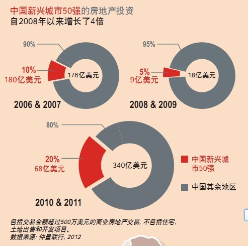 而在2010年和2011年,中国商业地产投资额达340亿美元,50强城市商业地产投资活动再度强劲反弹,交易占比一举翻了四番,占到全国商业地产投资市场的20%,直接投资额高达68亿美元。