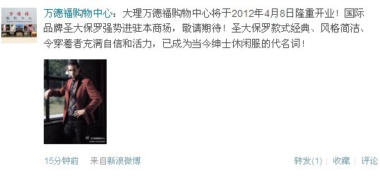 联商网快讯:大理万德福购物中心将于2012年4月8日隆重开业!国际品牌圣大保罗强势进驻本商场,敬请期待!圣大保罗款式经典、风格简洁、令穿着者充满自信和活力,已成为当今绅士休闲服的代名词!
