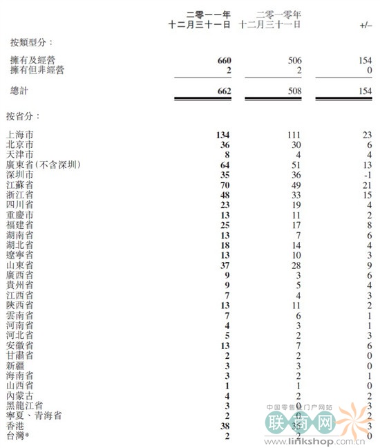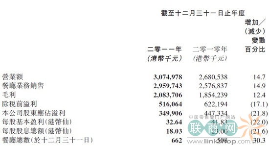 报告称,集团主要业务及重要收入来源为零售连锁餐厅业务。2011年止,餐厅总数662间,增加154间。