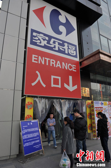 3月19日,河南郑州,民众聚集在家乐福花园店门口观看查封告示。从3月18日起郑州市工商局金水分局对该店进行了查封,要求该店进行停业整顿。据央视3·15晚会报道,花园店售货员将从同一个包装袋内取出的三黄鸡,随意放置在柴鸡和白条鸡对应的位置。这样一来,三黄鸡经过人为摆放,变成了“柴鸡”。不仅如此,央视还曝光这家家乐福存在着“返包”销售的现象,将过期产品重新包装后再进行销售。