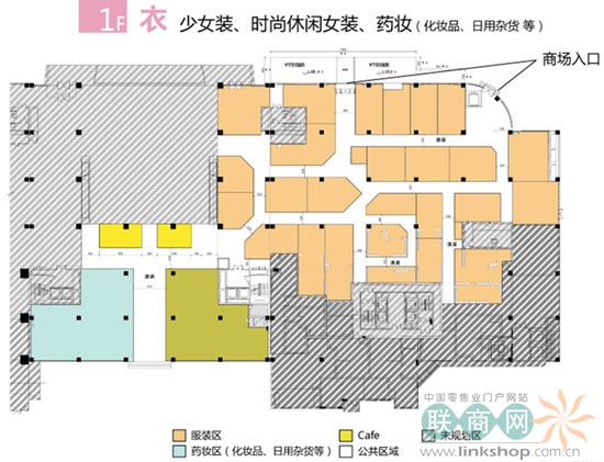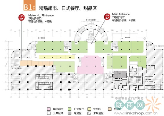 地下一楼的日本美食街(饮食店、甜品店、咖啡店、食材店)、1FL~4FL的日本流行时尚杂货、与苏宁电器、小南国相结合,提供多样化的流行趋势和消费文化。