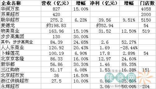 *联华超市:2011年新开门店390家。其中大型综合超市业态新开门店15家;超级市场业态新开门店171家,直营门店新开32家,加盟门店新开139家;便利店业态新开204家,其中直营门店新开61家,加盟门店新开143家。