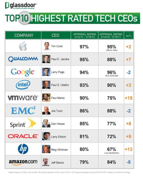 Glass Door从两年前开始公布CEO排名榜单,今天该公司发布了“科技行业10大CEO”榜单,另一份榜单则将在周五发布。Glass Door向被调查者提出的问题包括:“你是否赞成CEO领导公司的方式?”等。