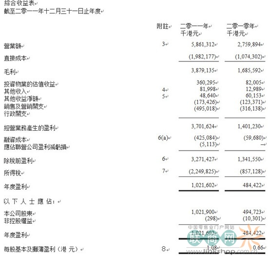 莱蒙国际2011年营业额较上年增长1.1倍 联商网3月30日消息:莱蒙国际今日发布2011年年度业绩公告。数据显示,莱蒙国际2011年年度营业额为58.61亿港元,比2010年增长约1.1倍,毛利率为66.2%,集团录得合同销售约50.36亿港元。2011年度,