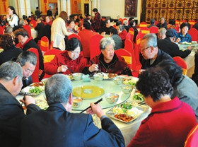 来自拱星墩街道的百名老人快乐就餐。