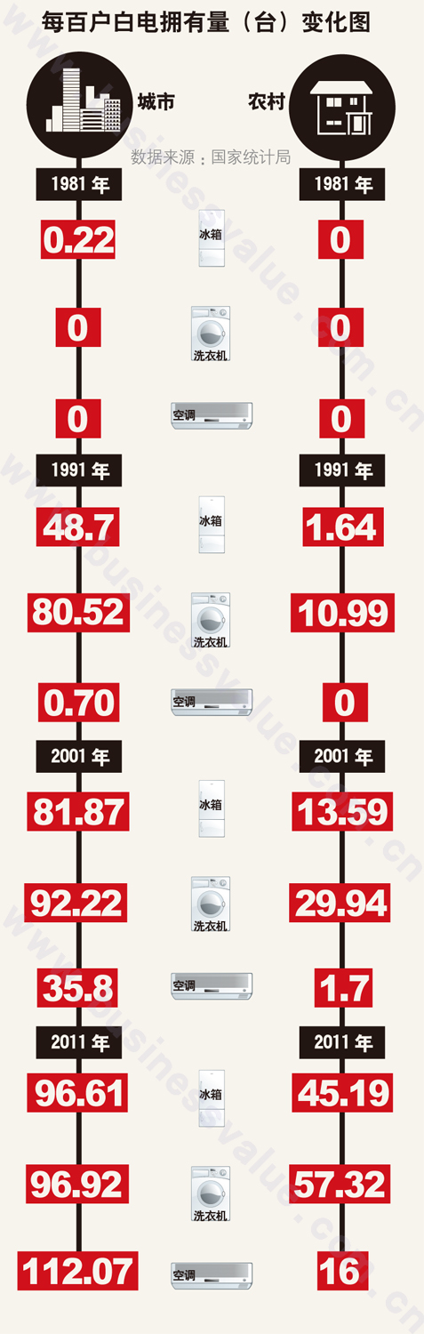 随着中国经济的快速发展,老百姓生活水平的不断提高,家电拥有率也在不断地提升,市场销售的红利空间却不断的降低。国家统计局数据显示,平均每百户城镇居民冰箱、洗衣机、空调2000年的拥有数分别是80.1、90.5、30.8,而到了2010年分别变为96.61、96.92、112.07,可以说城镇居民的拥有量基本已经饱和;而对于广大的农村市场,在家电下乡等政策的催熟下,2000年时,每百户农村居民冰洗空的拥有量分别是12.31、28.58、1.32,而到了2010年,分别变为45.19、57.32、16,相对于目前农村居民的收入水平和生活方式,已出现需求透支迹象,可以说农村市场快速增长的时期也已经成为过去。