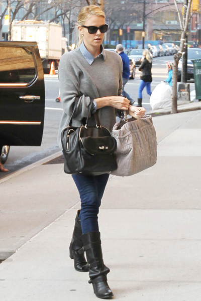 到达机场的影后简单地以蓝色紧身牛仔裤搭配灰色针织衫,内搭蓝灰色衬衫,轻松随意。近似色的搭配,令造型更和谐。