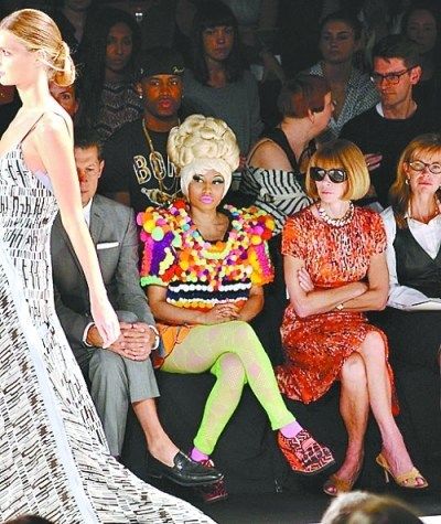 在卡罗琳娜-海莱娜设计师品牌秀场上,被誉为“美版凤姐”的美国饶舌女歌手妮琪·米娜(Nicki Minaj)与时尚女魔头安娜-温图尔(Anna Wintour)一同亮相秀场头排并交谈甚欢。“美版凤姐”保持了一贯的大胆着装风格:毒瘤发髻、糖果色上衣、荧光Leggings十分抢眼,但面对安娜-温图尔的强大气场时还是稍显弱势。安娜·温图尔依旧穿着她钟爱的印花长风衣,一脸淡定,总是摆着一副不食人间烟火的臭脸。