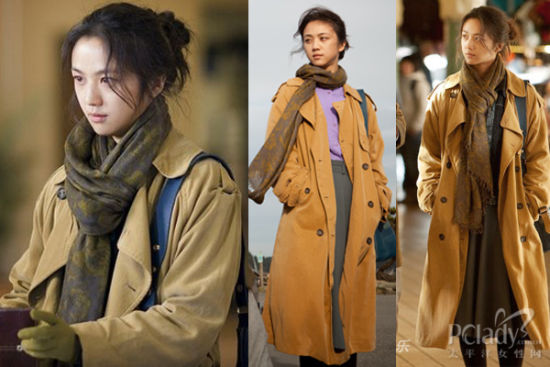 《晚秋》剧中汤唯和玄彬将“风衣情侣装”style表现的淋漓尽致,剧中二人多以长款风衣造型示人,这种穿搭方法可是很适合现在的升温大风天气呢。米黄色的长款风衣,双排扣设计更显女性的干练,军绿色的围巾则将秋天的落寂寞尽显,黑色的丝袜、及踝靴则展示了女性柔美可人的一面,蓝色的包则是整个造型的亮点。
