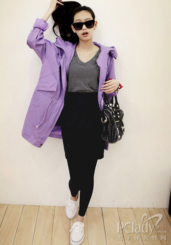今年春天亮色大行其道,在风衣上大块面地应用显得尤其出挑,紫色、苹果绿、橘红都是年轻女孩的首选。风衣款式也非常年轻化,你只需搭配上校园风味的棉衬衫和帆布鞋就能成为街头闪闪发光的女孩了。