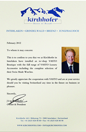 2012年,VASTO华斯度精品进驻瑞士顶级珠宝钟表店——奇士霍夫(Kirchhofer),与其广阔优质的销售平台强强联手,进一步赢得瑞士消费者的喜爱。