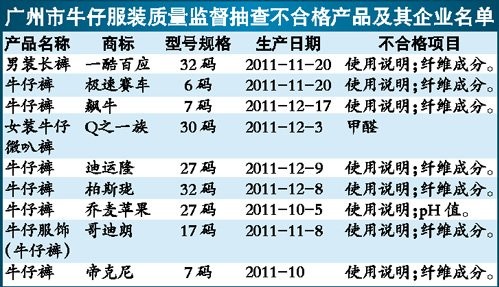 根据昨天广州市质量技术监督局公布的牛仔服装产品质量监督抽查结果,有9家广州企业生产的9批次产品不符合标准要求。本次共抽查了广州市87家企业生产的100批次牛仔服装产品,其中,广州市钰丰服装有限公司生产的一款商标为“Q之一族”的女装牛仔微叭裤甲醛超标。