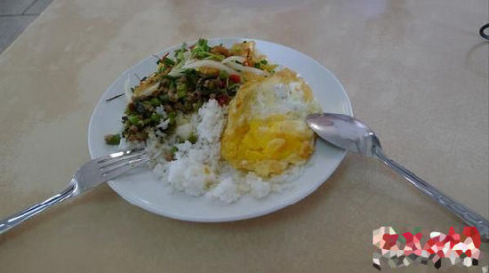 图是在曼谷泰国国立法政大学学生餐厅吃的快餐。价格30铢100人民币可以吃15份。不过泰国大米真的很好吃。