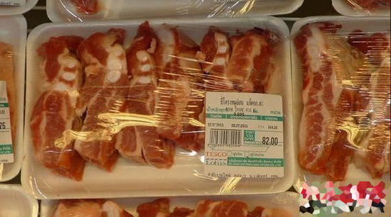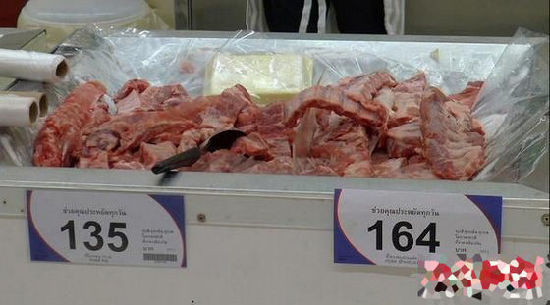 瘦肉和排骨一个价格135铢一公斤, 100人民币可以买3.5公斤。