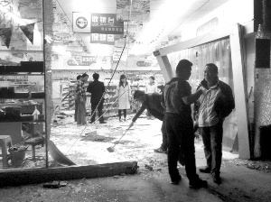 “有一个男的被撞到了。”一位遛狗的老太太目击了事发过程,她告诉记者,这辆轿车本来是停在门口广场上的,但跳舞的老太太们说,这是她们平时跳舞的地方,让驾驶员挪个地方。一个小伙子就坐进车里,发动后,不知道怎么回事,突然猛地倒回去,哐当一声就上了台阶,直冲进店里。被撞到的是一个顾客,但伤势不是太重,被救护车送进了医院。