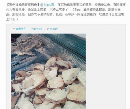 “给宝宝买的鳕鱼,原来是油鱼,在欧洲被列为有毒鱼种,是禁止上市的,太坑爹了!”今天上午,北京网友“颜”(化名)在网上发帖称自己竟从家乐福超市买到“赝品”鳕鱼,在倍感失望的同时更开始为家人的健康担心。帖子两小时内被转发830余条,引发各地网友关注。许多人表示鳕鱼的安全食用问题已不是“新鲜话题”,有关部门应该加强对无良商家的监管。