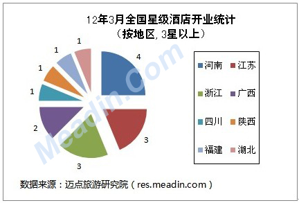 据迈点旅游研究院对国内酒店开业情况的不完全统计,2012年3月,国内开业的星级酒店数为16家,客房总数约4031间(套)。与上月相比,本月新开业星级酒店总数增加了5家,增幅为46%;而客房总数与上月相比增加约1349间(套),增幅为50%。