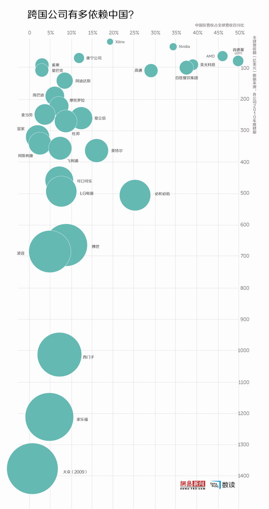 跨国公司究竟有多依赖中国市场?少了中国市场,是否就会一蹶不振?我们查找了数家公司的年报,数据可能要让很多人失望——事实上,少了中国市场,对大部分跨国公司来说,并没有太重要。中国遍地开花的家乐福超市主要营收仍在法国,2011年其中国市场营收81.69亿欧元,还不到其全球总营收的10%。即便是几乎在世界任何角落都能看到的可口可乐,中国市场的营收也只占其总营收的7%左右。我们最常见的跨国公司中,也许只有百胜集团旗下的肯德基离开中国市场将会困难重重——肯德基在中国的营收占其总营收的49.8%,差不多是其一半的份额。
