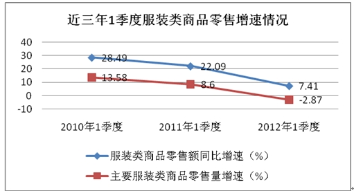 根据中华全国商业信息中心对全国百家重点大型零售企业的统计,一季度服装类商品零售额同比增长7.41%,较去年同期放缓14.68个百分点。受天气回暖较晚、价格涨幅较大的影响,一季度主要服装类商品零售量同比出现下滑,增速为-2.87%,较去年同期下降11.47个百分点。一季度服装类商品销售额、销售量增速均为近三年同期最低。