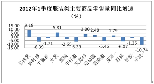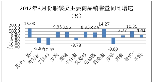 对比3月份主要服装类商品零售量增速,男西装、女装、童装、夹克衫、运动服、防寒服、针织内衣裤零售情况较好,同比增长分别为15.03%、9.33%、8.96%、8.93%、8.46%、14.27%、10.35%,较今年1-2月份同比增速分别提升7.85、5.04、15.29、7.19、8.55、22.49、16.15个百分点;男衬衫、T恤衫、皮革服装零售情况出现下滑,同比增速为-8.89%、-10.93%、-9.89%,较今年1-2月份同比增速分别回落3.70、14.76、14.48个百分点。