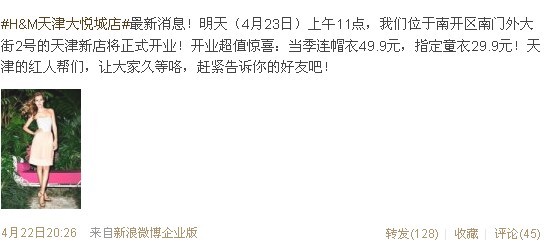 联商网快讯:H&M天津第三店(天津大悦城店)于今日(23日)上午11点开门迎客。位于南开区南门外大街2号,届时将有各种新品上市。