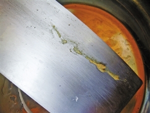 回到家后,王阿姨先把一块一斤多的肉切成小块。一刀下去,她看到,猪肉有点不对劲。“有几个脓包,刀刚好切到一个,黄绿黄绿的东西流出来,很恶心。”她说。