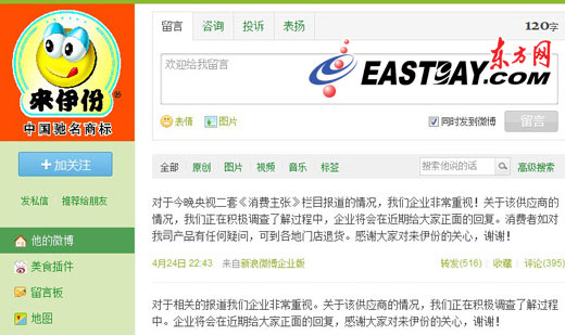 对此,来伊份通过官方微博回应称,对于4月24日晚央视二套消费主张栏目的报道企业非常重视,关于该供应商的情况,正在积极调查了解过程中,企业将会在近期给出正面的回复。消费者如对产品有疑问,可到各地门店退货。