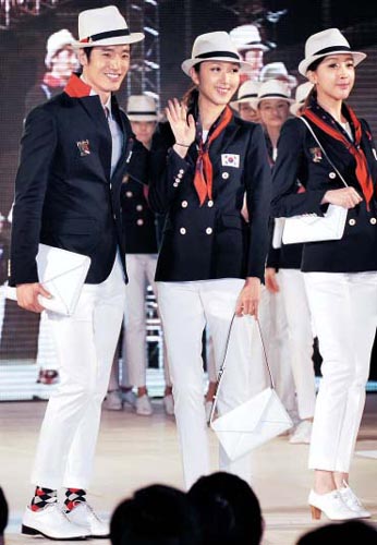 据韩国《朝鲜日报》24日报道,2012年伦敦奥运会韩国代表队服装23日在首尔泰陵选手村综合体育馆公开。