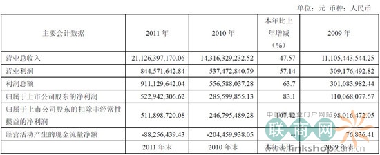 营业收入为211.26 亿元,比董事会预算指标160 亿元增加51.26 亿元,比2010年实际完成的143.16 亿元增长48 %。