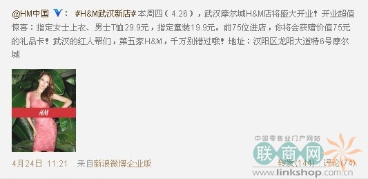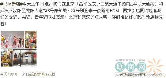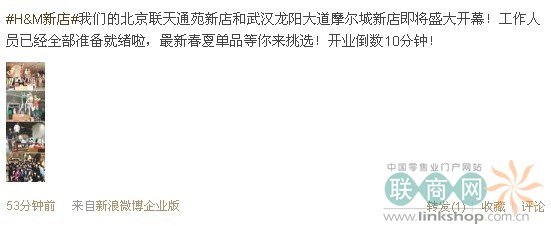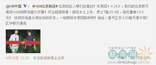 联商网快讯:H&M今天又新开两家门店。H&M北京联天通苑店于今日(26日)开门迎客。同一时间,H&M武汉摩尔城店也于明天上午11点开门迎客。女士上衣、男士T恤、童装等全新登陆。