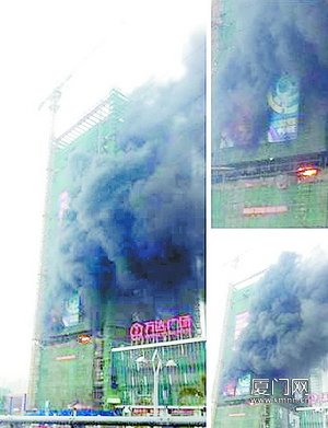 在建工地起火,浓烟覆盖了20多层高的楼房。昨日下午5时许,这起火灾发生在湖里万达广场旁一栋尚未竣工的酒店大楼。记者采访过程中,事发工地里的一名男子竟称这是“演习”。