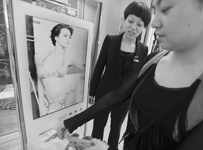 “将衣服的标签放入扫描器,就可以在LED显示器上看见模特身穿该款服装的效果图和尺码信息”。图为昨日,记者在武汉广场内衣专柜见到这款电子导购机。