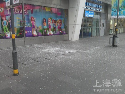 据上海滩(t.xinmin.cn)网友“@小殷mashuil”介绍,下午4时许,位于万达广场商业街宝大祥儿童购物中心上方的一块玻璃幕墙突然发生爆裂,玻璃碎渣散了一地。破碎的玻璃大约30cm×50cm见方,高度约在3层楼位置。
