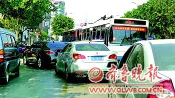 上图:5月4日上午,泉城路中段,大量等候进入恒隆免费停车场的汽车挡住了公交车专用道,101路电车被阻。 (来源:齐鲁晚报)
