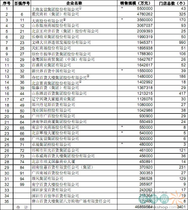 ②大商股份有限公司销售额为含税的上市公司营业收入。