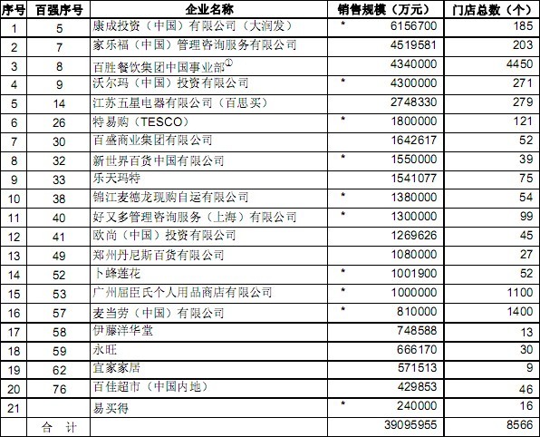 今年连锁百强的改进,一是在统计口径上,上市公司按含税口径计算,与年报数据有所不同;上市公司外,非上市部分要求按业务分拆销售额和门店数;企业内部配送业务不重复计算;加盟店销售超过整体销售50%的,不在“连锁百强”中排名;剔除批发市场、生产资料、经营场地交易额等。二是专家参与,对出入较大的数据进行调查与评估。