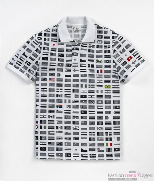 世界各国的国旗以黑白色铺陈在整件Polo衫上,将16个被选国家的国旗图案映衬的更引人注目。