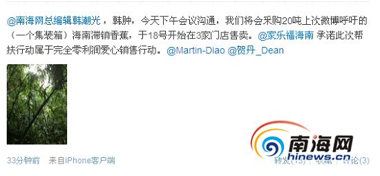 5月10日晚,新浪微博上传来令人振奋和感动的好消息,新浪微博网友“阿麦郎”发微博称:“今天下午(家乐福)会议沟通,我们将会釆购20吨上次微博呼吁的(一个集装箱)海南滞销香蕉,于18号开始在3家门店售卖。@家乐福海南承诺此次帮扶行动属于完全零利润爱心销售行动。”此消息一出,引发众多新浪网友微博跟帖叫好,微博上一时间出现无数个翘起的“大拇指”,场面令人感动。