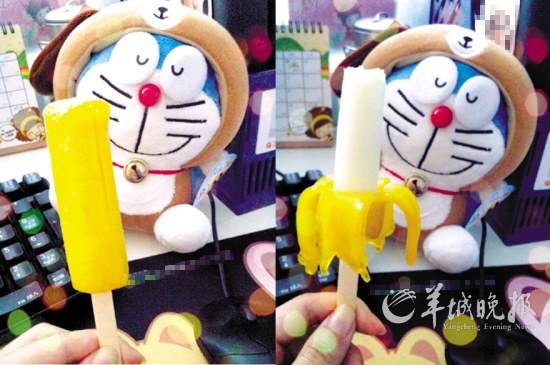 最与众不同的是雀巢“笨NANA”雪糕,“香蕉皮”、“香蕉瓤” 黄白相间的“笨NANA”,24 小时后依然“泾渭分明”。“香蕉皮”变成了透明状胶体,提着冰棍棒仍然能完整地拎起来,只是比冰冻时软了很多; 与此同时,“香蕉瓤”溶化成了液体,顺着“香蕉皮”流下来。两种盒装冰激凌也很不平常,看上去和24小时前却没多大变化。
