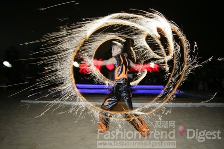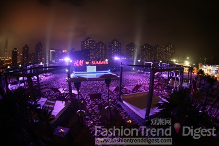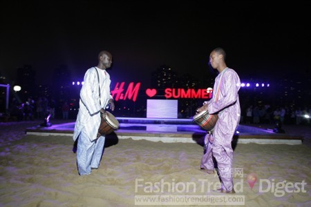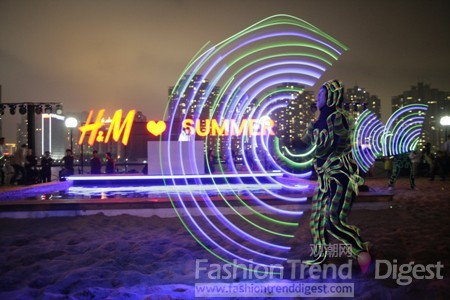 此次摩登夏日风行海滩派对处处有惊喜。来宾们纷纷佩戴H&M别出心裁的太阳镜派对邀请函出席。晚上九点半,火舞、非洲手鼓舞、荧光舞表演开始,全场一幅夏日火热场景。随着沪上著名DJTrix的音乐,身着H&M泳衣的达人在沙滩中间的泳池边嬉戏,跳舞。围绕着舞台,还摆放了木制躺椅与大床。时尚达人们在棕榈树下讨论自己对时尚和H&M新品的看法。所有人都感受到了H&M旋起的强大时尚夏日风。