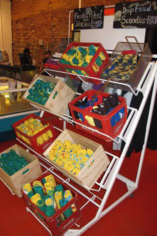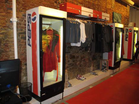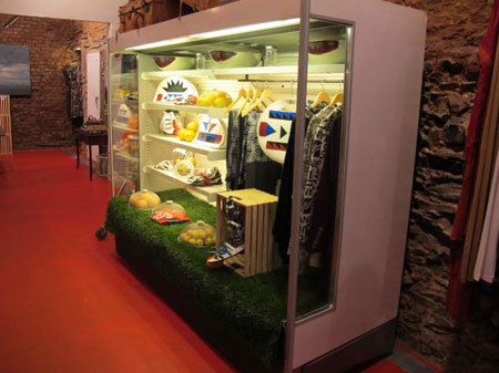 8月造访了位于开普敦的 the Fashion Deli 时装店,该店完全以食物作为主题。他们将服装展示于百事可乐冰箱,熟食冰箱以及冰淇淋冷冻柜里,而鞋子和配饰则被置于购物篮、木条箱、蔬菜架或玻璃罐里。 黑板上半开玩笑地写着“新鲜采摘的棉 T 恤”以及“生煎连帽围巾”的字样,更增强了超市一般的感觉。橱窗里甚至还摆上了桌椅,给路人营造出置身咖啡店的错觉。
