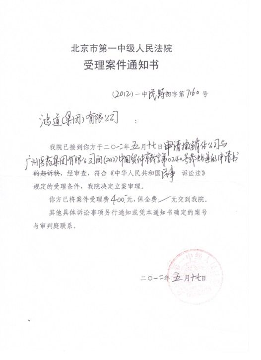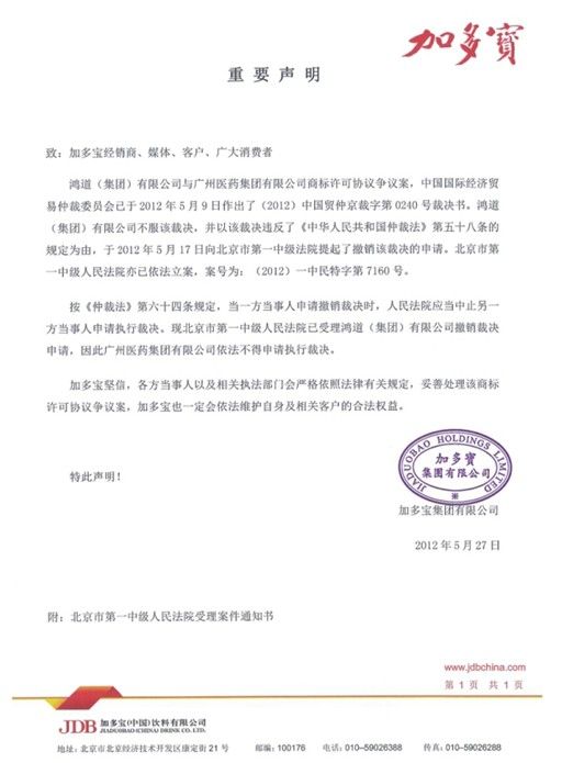 加多宝集团今日发布声明,称中国国际经济贸易仲裁委员会于5月9日作出裁决后,鸿道(集团)有限公司不服该裁决,并已于5月17日向北京市第一中级法院提出了撤销该裁决书,北京市第一中级人民法院已依法立案。