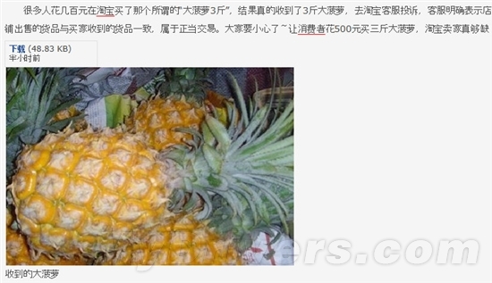 日前有用户在微博以及论坛上爆料称他们为了玩《暗黑破坏神3》,就在淘宝购买了所谓的“美国第三代大菠萝”或者“大菠萝3斤”,但最后收到的不是《暗黑破坏神3》,而是真真正正的3个菠萝,还是大个儿的。四百多块钱买了三个菠萝,亏大发了。
