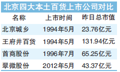 借此,翠微股份的市值达43.37亿元,超过了北京城乡23.76亿元的市值。王府井百货和首商股份的市值分别为131.94亿元和65.25亿元。