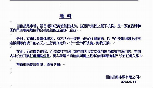 针对近日有不法分子盗用百佳的注册商标,以“百佳集团网上超市连锁国际商城”的名义,进行网络欺诈一事,百佳超级市场有限公司向本网发来紧急声明,表示百佳超级市场目前在国内只有实体的连锁超级市场门店,在国内并没有开展任何网购业务,更与所谓“百佳集团网上超市连锁国际商城”没有任何关系,敬请市民提高警惕,慎防受骗。