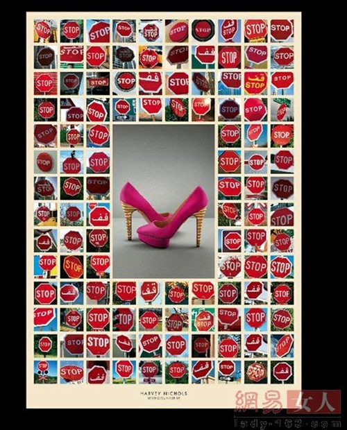 Harvey Nichols 2009年的春夏新装而推出的。粉色高跟鞋气场太强,犹如Stop指示牌警告“俗人勿近”……种种符号都证明了。