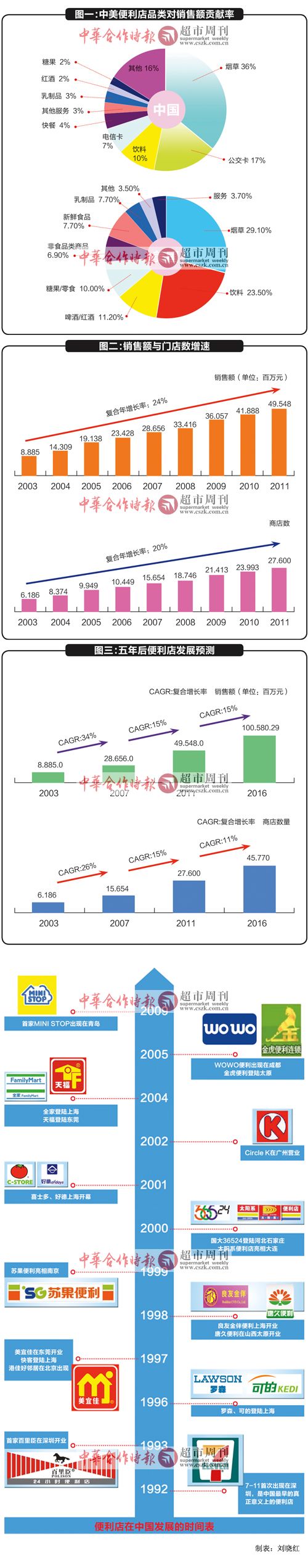 尤其是在广东、上海等便利店密布的地区,外资便利店凭借其先进设备、管理等优势全力拓展,而本土便利店通过“自学”和模仿,甚至使用山寨的手段也茁壮起来。这些在门店数、销售额的数据上都可以表现出来(见图二)。