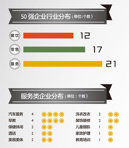 足疗保健和美容美体行业有4家企业入围,都是以加盟店为主并且扩张迅速。行业门槛低可以方便创业者加盟但是也存在相当风险,创业者需要加强对特许商的考查。