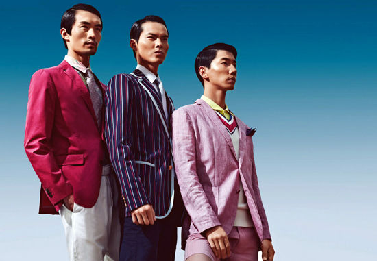 竖条西装上衣、深蓝色西装长裤:Kent&Curwen