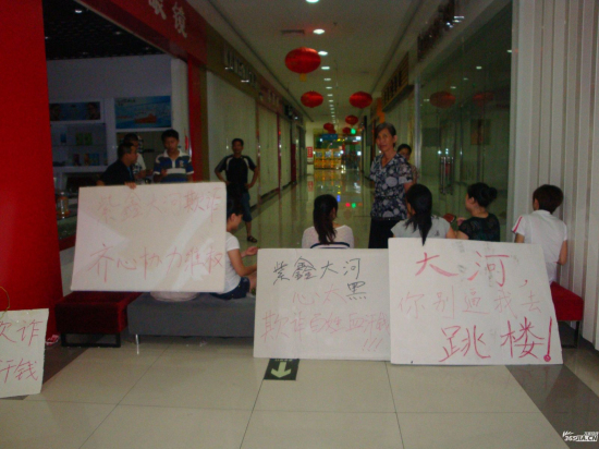 下午6点多,小编来到了位于黄山路与西二环交口的紫鑫大河广场(俗称沃尔玛超市),在三楼的一个路口小编看到10几位业主举着写有“紫鑫大河心太黑”、“紫鑫大河欺诈”等字样的牌子表达自己的不满。